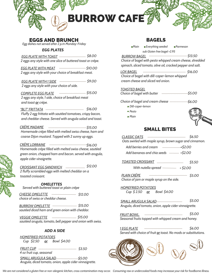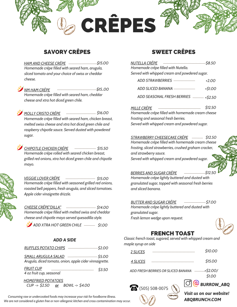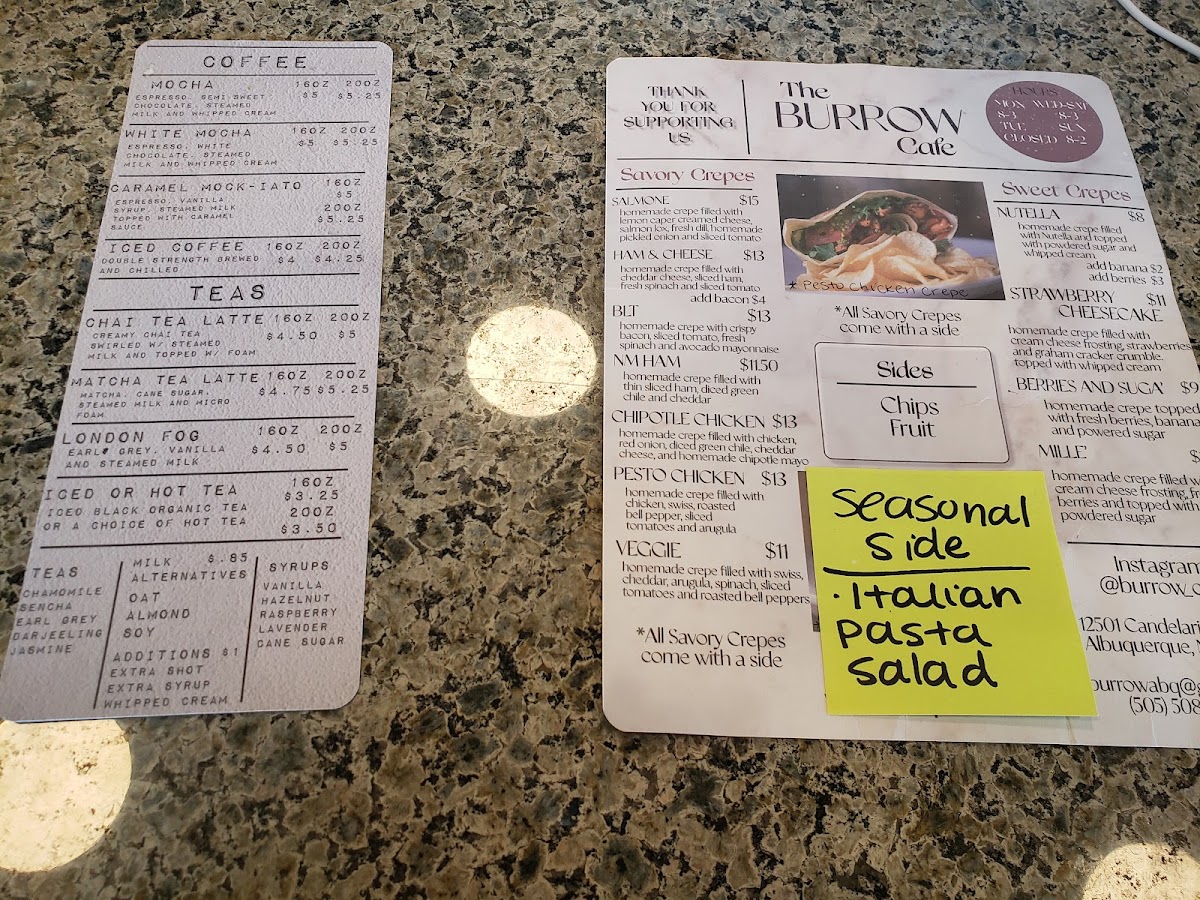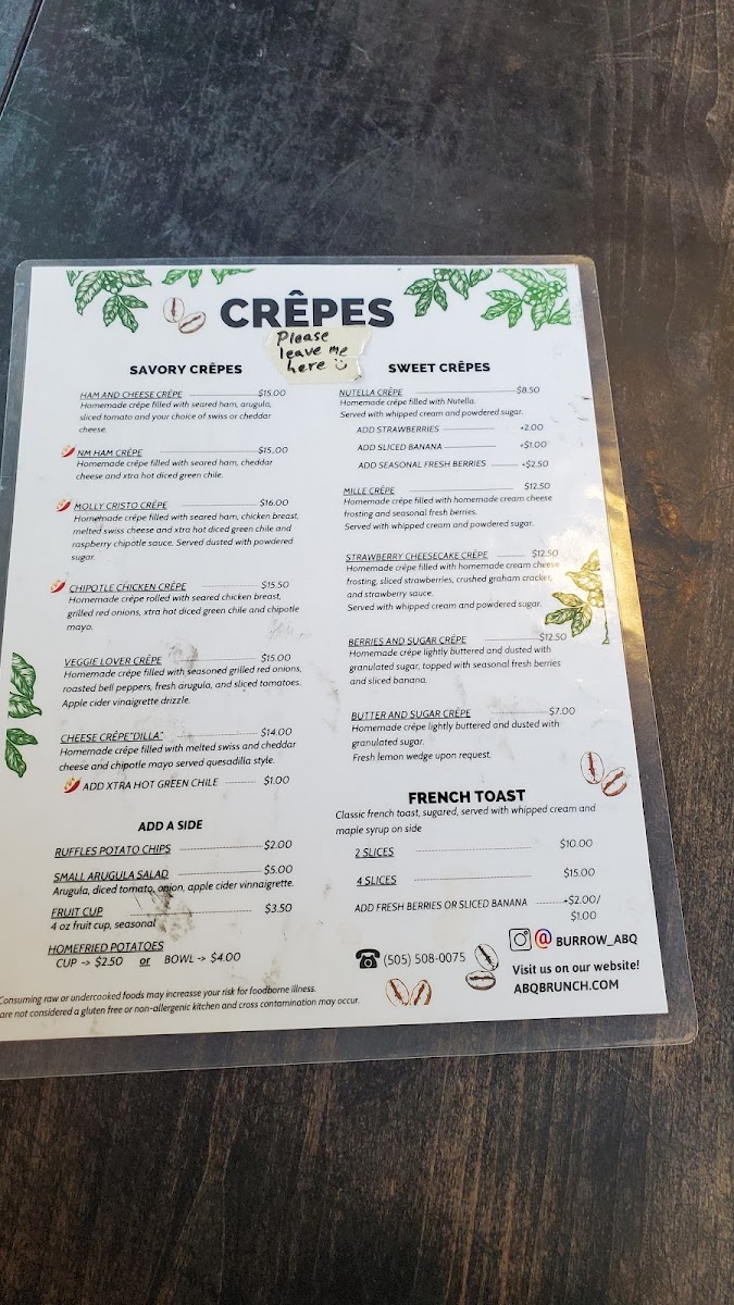Welcome to The Burrow Cafe, a delightful culinary destination located at 12501 Candelaria Rd NE, Albuquerque, NM. This charming cafe specializes in build-your-own crepes, allowing you to customize your meal to perfectly suit your palate. Priced between $7.00 and $8.00, these crepes are best enjoyed fresh within 15 minutes, ensuring maximum flavor and satisfaction.